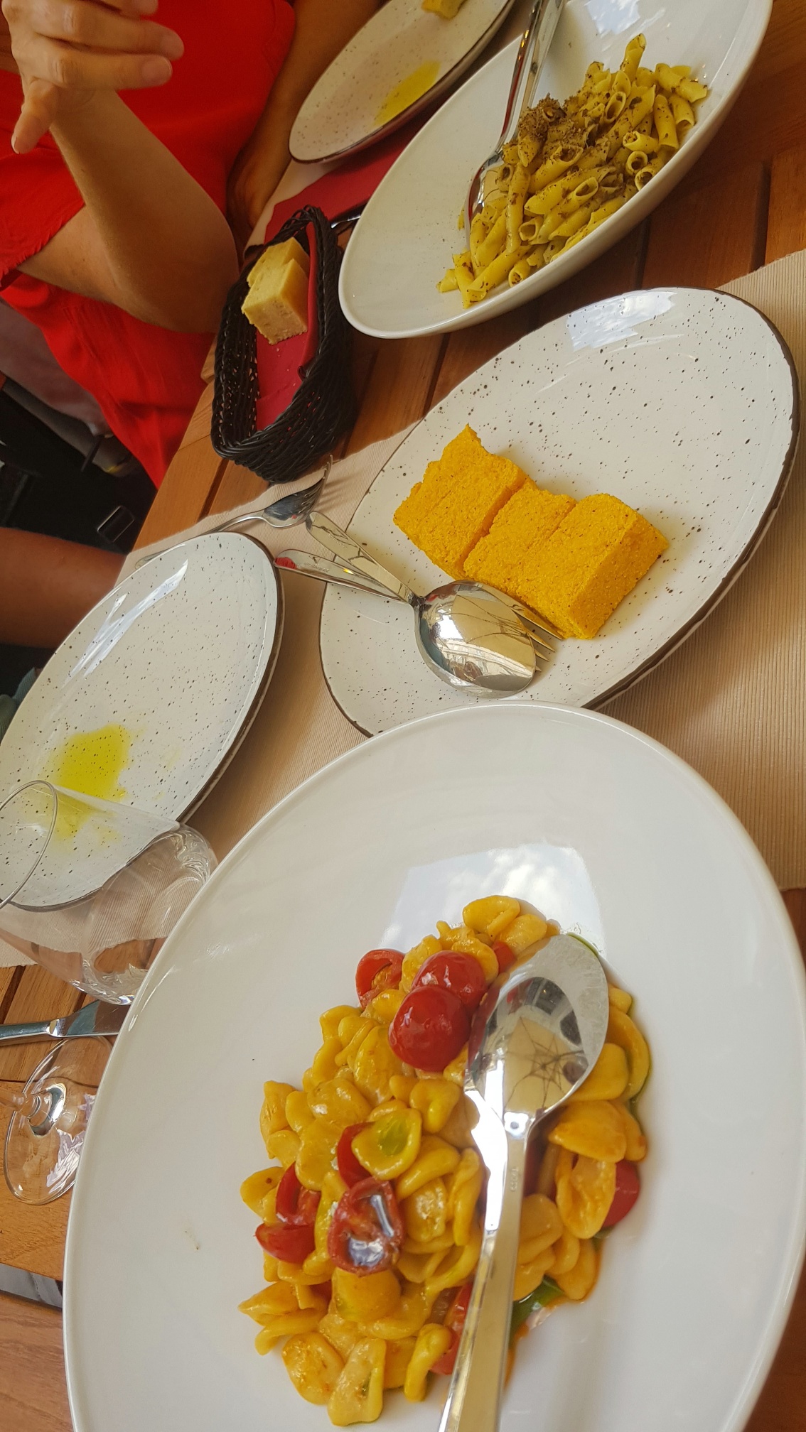 Pasta and Polenta Published August 23, 2022 at 1134 × 2016 in Pasta and Polenta Orecchiette with tomatoes (OK), Polenta blocks to be eaten with a hearty and thick seafood stew/soup (yum!) and homemade Fusi pasta with truffles (heavenly!).